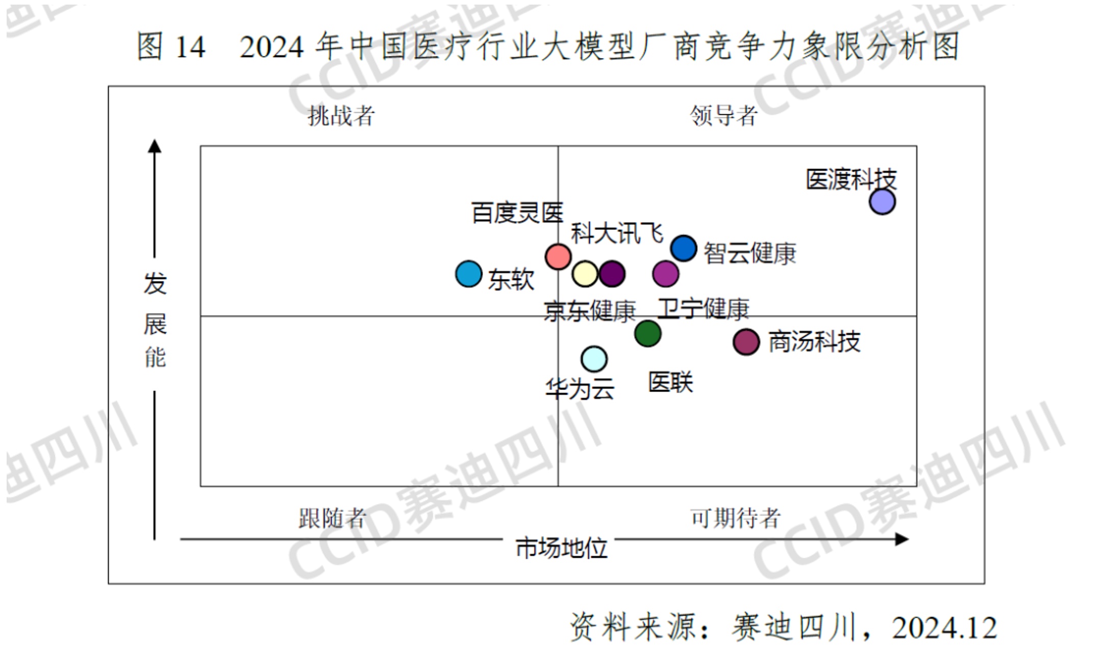 根据中国国际广播电台经济之声联合赛迪顾问股份有限公司发布的《2024年人工智能大模型行业调查研究报告》,医渡科技在市场地位和发展能力两个关键指标上均表现卓越,稳居领导者象限第一。