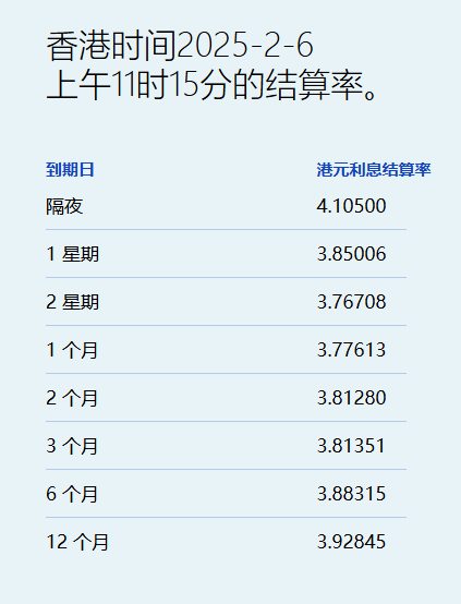 智通财经APP获悉,港元拆息继续普遍上升,其中,隔夜息升近16基点至4.105%,与楼按相关的一个月拆息结束四连跌,报3.77613%,齐见1月28日以来最高。