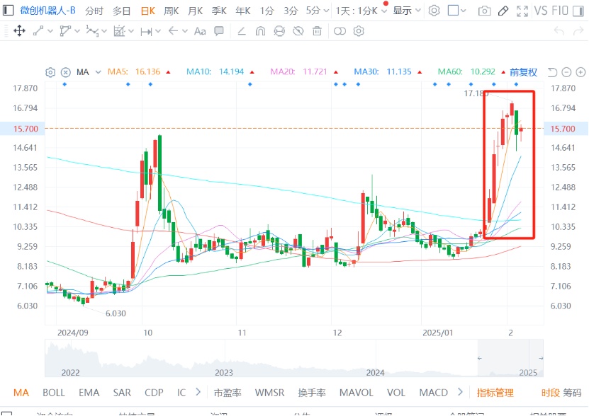 在此背景下,微创机器人股价进入快速上扬阶段。从这一阶段来看,微创机器人股价沿5日、10日均线稳步上行,形成了一段陡峭的上升通道。1月24日午后,港股机器人概念板块集体走强,微创机器人股价单日涨幅超24%,并伴随显著放量,显示出多头占据主导的态势。