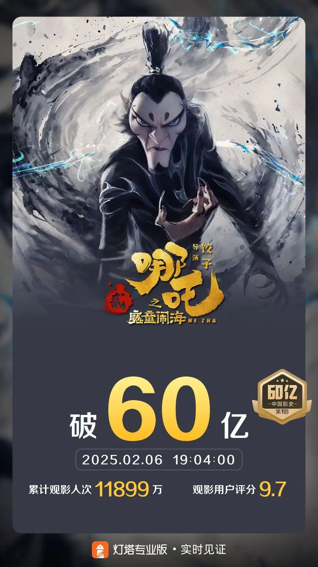 智通财经APP获悉,据灯塔专业版,截至2月6日13时30分,影片《哪吒之魔童闹海》票房(不含预售)超过《长津湖》,成为中国影史票房冠军。截至19时4分,《哪吒之魔童闹海》票房突破60亿。