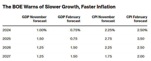 这一变化的另一个原因是,英国央行下调了对英国生产率的估计,这使得更快的经济增长将成为通胀。它将今年的经济增长预测减半至0.75%,但预计潜在增长率将从2026年恢复到1.5%。该央行将此次下调归咎于持续疲软的生产率,并暗示工党增加国民医疗服务支出可能会使情况变得更糟。