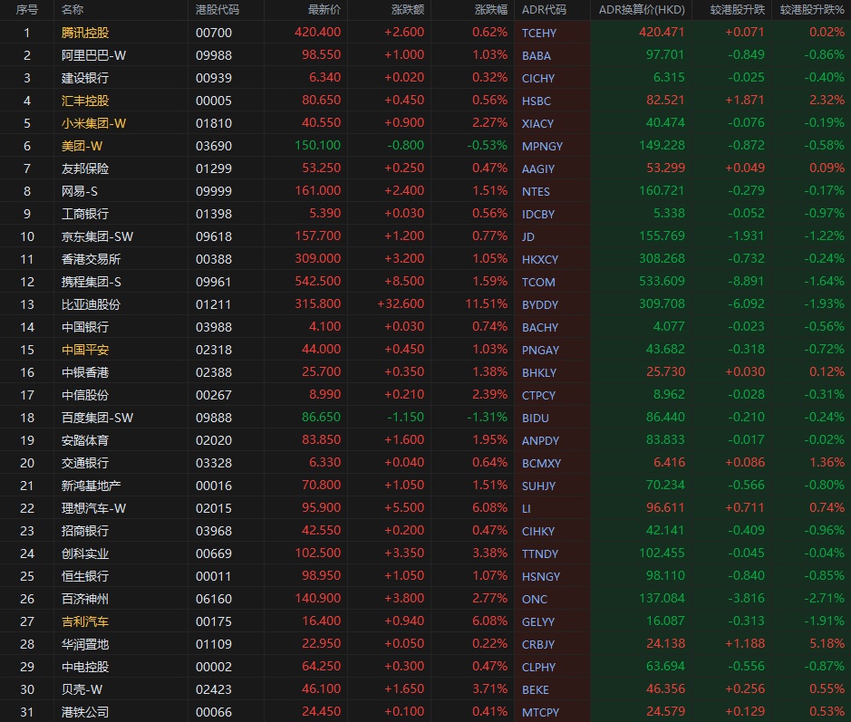 大型蓝筹股多数下跌,汇丰控股收报82.521港元,较香港收市涨2.32%;腾讯控股收报420.471港元,较香港收市涨0.02%。