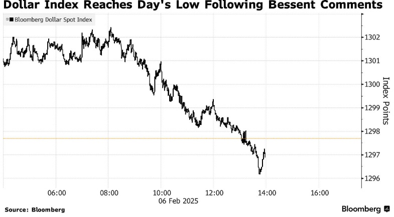 在贝森特发表讲话时,彭博美元现货指数几乎没有变化,随后在纽约时间的下午交易时段跌至当日最低点。美国新任财政部长贝森特重申,特朗普政府将继续推行“强美元”政策,强调公平贸易并反对其他国家通过货币贬值操纵贸易。