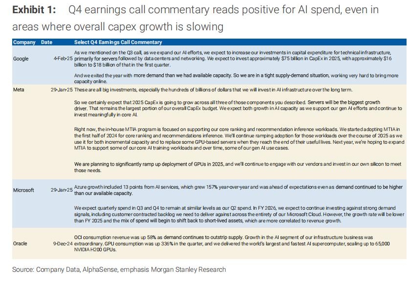 下图显示,甲骨文(ORCL.US)、微软(MSFT.US)、Meta(META.US)和谷歌(GOOGL.US)高管在最近一次各自业绩电话会上对AI支出的评论,摩根士丹利总结认为,他们的言论都是正面的,尽管所在领域的总体资本支出增长在放缓。