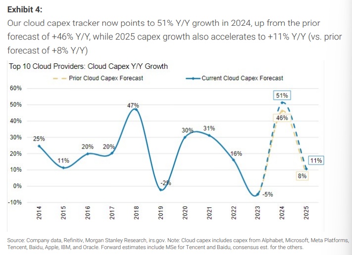 而摩根士丹利大中华区半导体研究团队预计,2025年前十大云厂商的资本开支将同比增长11%,此前预计为8%。