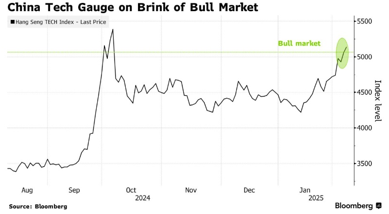 智通财经APP获悉,由于DeepSeek所推出的性能堪比OpenAI o1大模型,但是AI训练与推理成本却比OpenAI低得多的开源AI大模型DeepSeek R1,引发全球投资者对中国互联网公司以及对于中国半导体与软件领军者的狂热看涨情绪,在香港股市交易的中国科技股基准指数——恒生科技指数步入“技术性牛市”。在A股市场,涵盖众多科技股的创业板截至周五上午收盘暴涨超3%,周涨幅已接近7%,该指数自10月以来长期处于横盘震荡,近期跟随DeepSeek引发的中国科技股狂欢而大幅反弹。