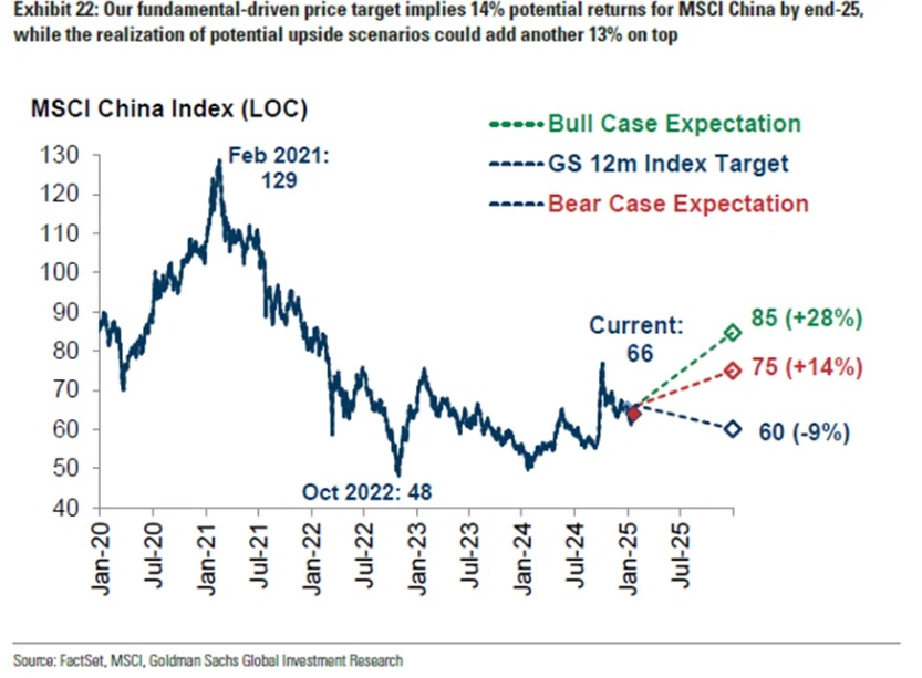 华尔街大行高盛在经历“DeepSeek冲击波”重创美股科技巨头之后,重申该机构对于中国股市的看涨热情,高盛预期在中性预期下,MSCI中国指数今年有望出现14%的涨幅至75点,乐观预期下该指数涨幅则将飙升至28%,高盛强调,“软科技”领域的股票表现有望强于整个大盘。MSCI中国指数涵盖阿里巴巴、腾讯、贵州茅台以及长江电力等中国核心资产,当前徘徊于67点附近。