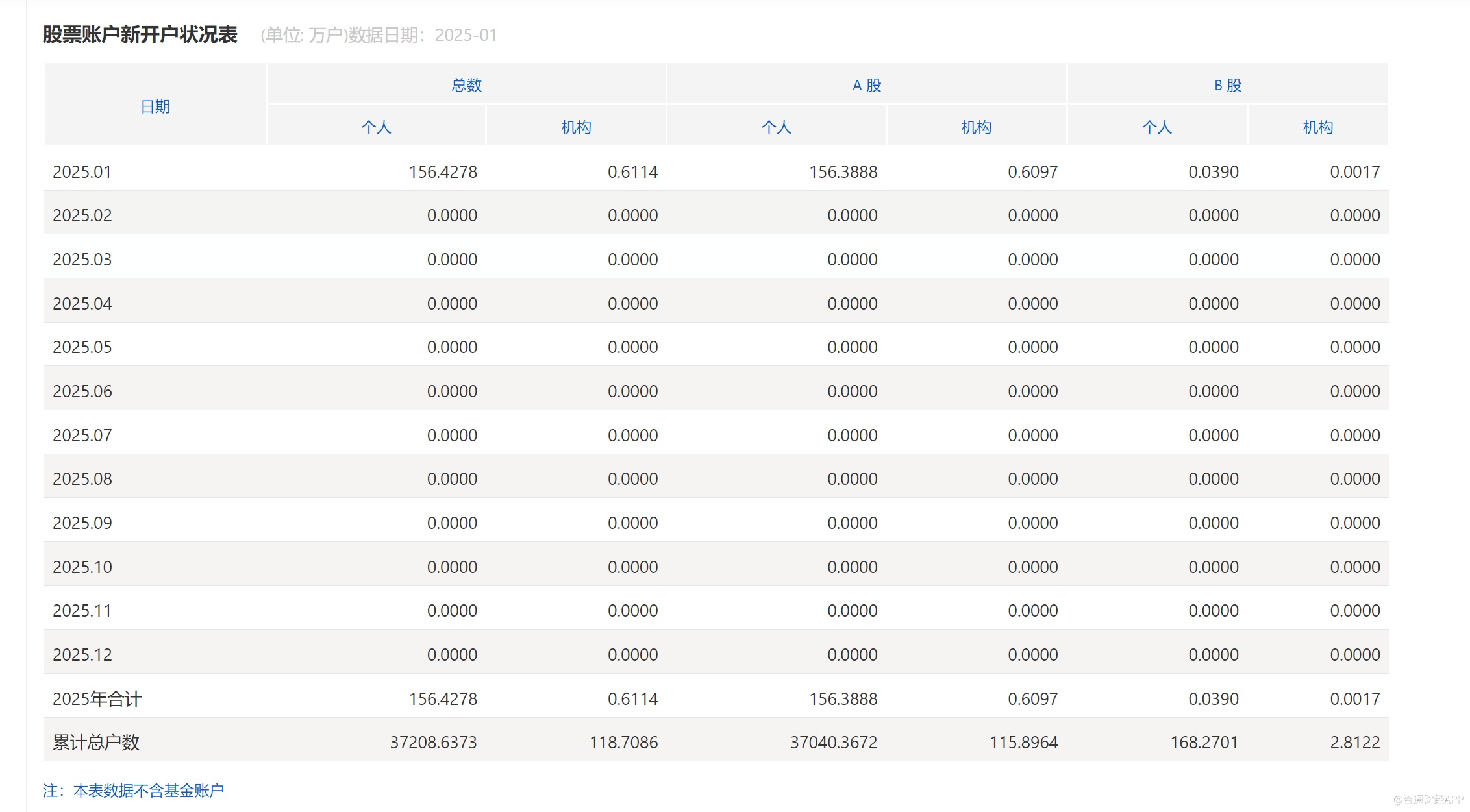 智通财经APP获悉,上交所最新披露2025年1月A股新开股票账户数据。数据显示,2025年1月个人投资者新开A股账户达156.3888万户,机构投资者新开户数为0.6097万户。2024年有6个月新开户数在150万以上。