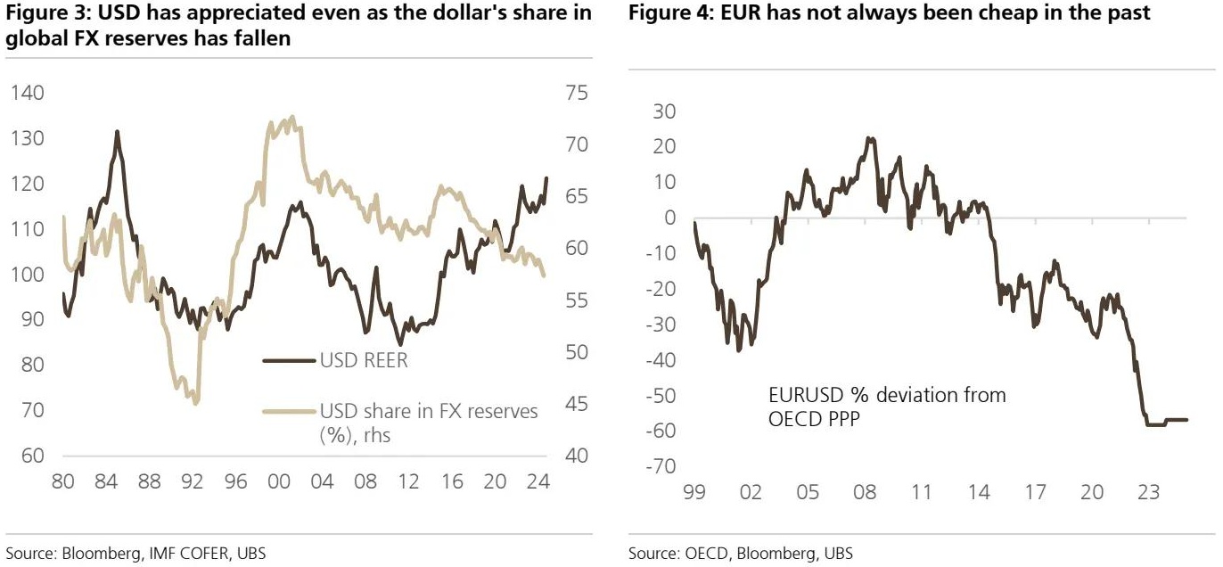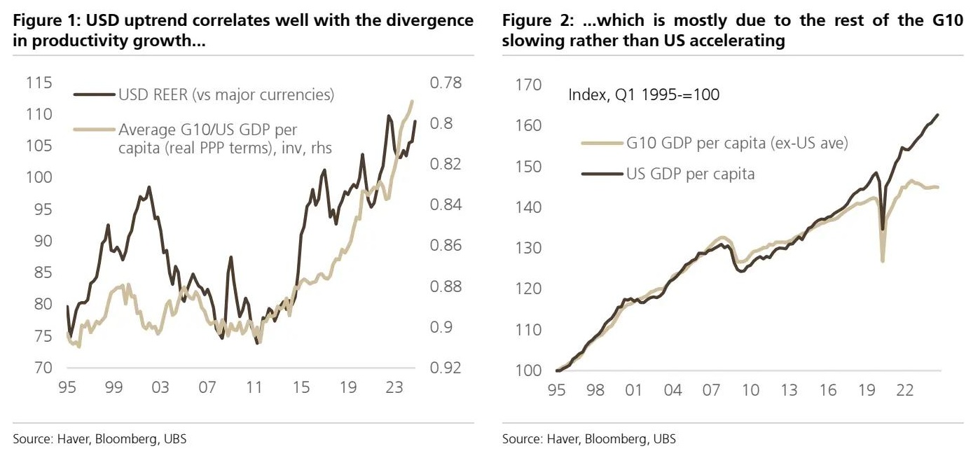 然而,瑞银认为,认为美元的储备货币地位是近年来美元持续走强的主要驱动力,这是一种牵强说法。相反,瑞银认为当前的美元超级周期——即比以往周期持续时间更长的强势时期——在很大程度上是由老式的经济基本面驱动的,尤其是美国GDP生产率的显著表现。因此,除非美国经济增长基本面也恶化,否则瑞银怀疑干预是否有必要,或者干预是否可能非常有效地削弱美元。