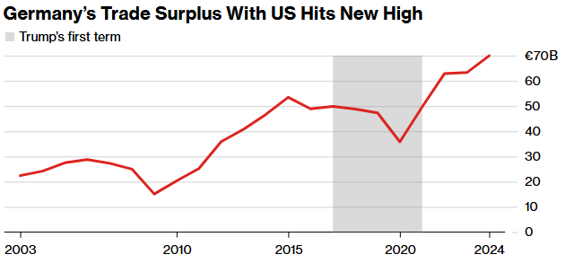 德国贸易顺差的扩大反映了出口的增加和进口的减少。对美国商品的需求下降,可能在一定程度上是由于欧洲最大经济体的疲软。德国去年国内生产总值(GDP)连续第二年萎缩,2025年亦前景黯淡。最近,德国政府将今年经济增长预期从1.1%大幅下调至仅0.3%。