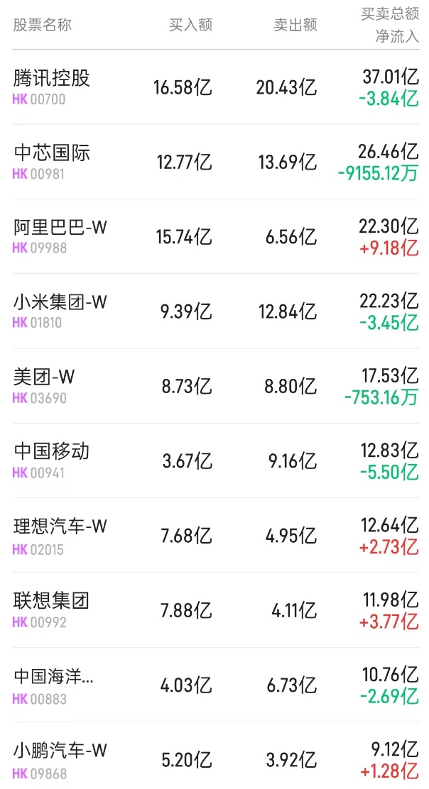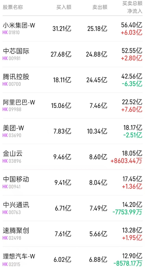 此外,小米集团-W(01810)获净买入2.57亿港元。而腾讯(00700)、中国移动(00941)、中兴通讯(00763)分别遭净卖出10.18亿、4.13亿、7753万港元。