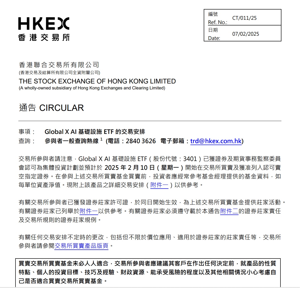 AI基础设施ETF(股份代号:3401)已获香港证券及期货事务监察委员会认可为集体投资计划并预计于2025年2月10日(星期一)开始在交易所买卖及获准列入认可卖空指定证券。