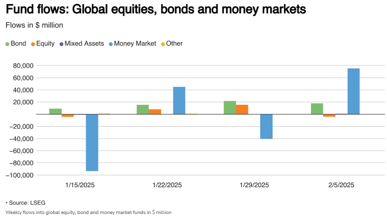 智通财经APP获悉,截至2月5日,全球股票基金出现了七周内第二次周度资金流出,原因是美国总统特朗普宣布对墨西哥、加拿大和中国征收关税,投资者变得更加谨慎。