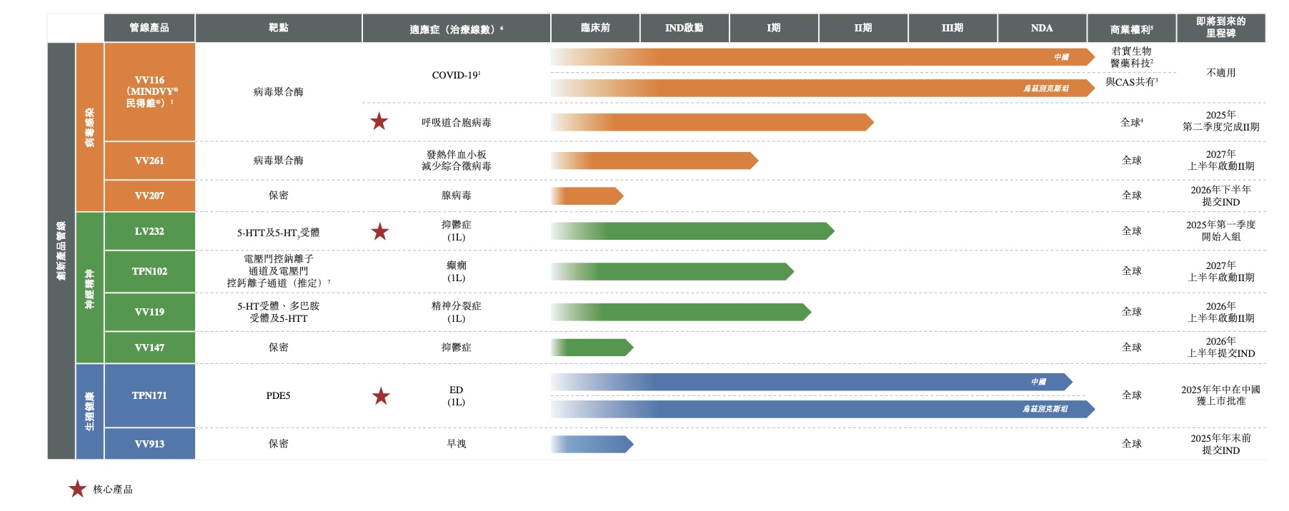 公司的核心产品VV116、LV232及TPN171分别专门靶向抗病毒药物市场、神经精神药物市场和生殖健康药物市场。