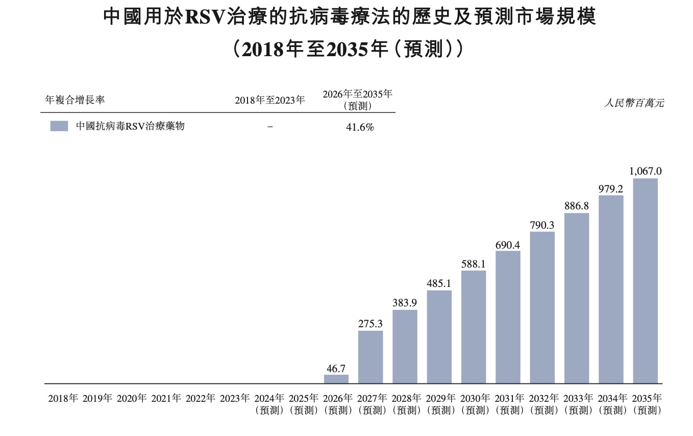 目前,开发用于RSV治疗的小分子抗病毒产品是全球范围内尚未被满足的重大医疗需求。然而,全球范围内尚无针对RSV感染的创新小分子抗病毒药物获批。随着首个创新小分子抗病毒疗法预计于2026年获批,全球市场预计将于2026年达到670万美元,并于2035年之前大幅增至8.8亿美元,2026年至2035年的年复合增长率为72.0%;其中,中国用于RSV治疗的小分子抗病毒疗法市场预计将于2026年达到4670万元,并于2035年之前大幅增至10.67亿元,2026年至2035年的年复合增长率为41.6%。