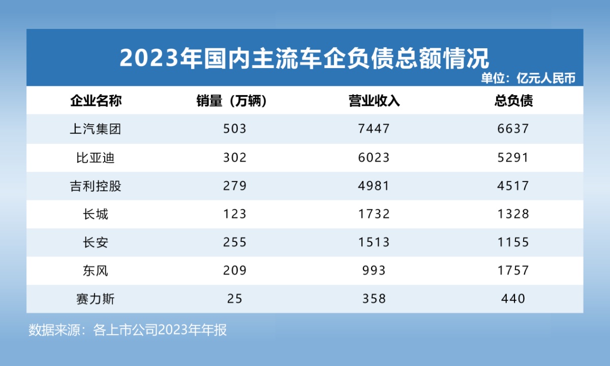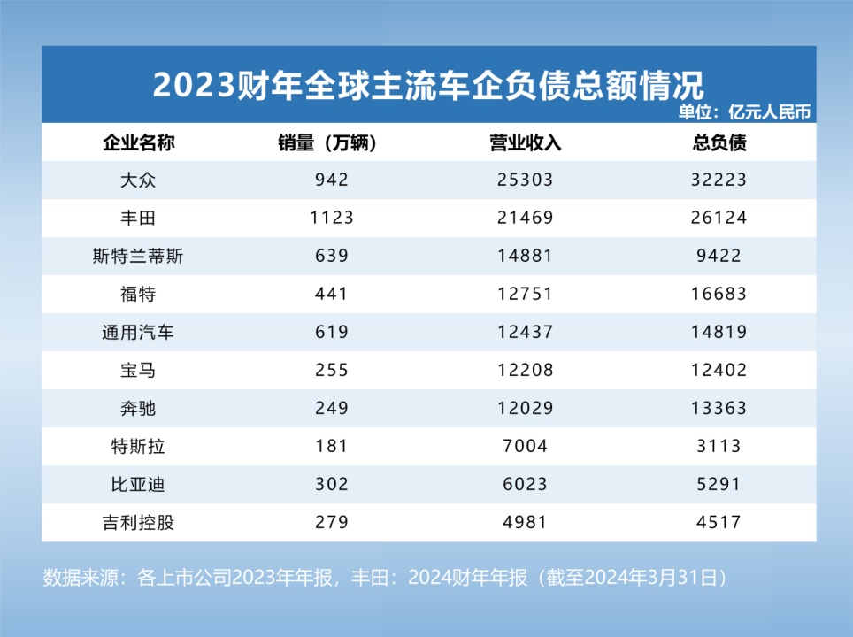 财报显示,2023年,大众集团营收2.5万亿元,总负债达3.2万亿元,比同期营收高28%;丰田营收2.1万亿元,总负债达2.6万亿元,比同期营收高24%。仅大众与丰田两家头部车企的总负债就达到近6万亿元,像福特、通用、宝马、奔驰等车企总负债也超万亿。可以看到,海外主流车企的总负债都是“万亿户”,处于较高的水平。