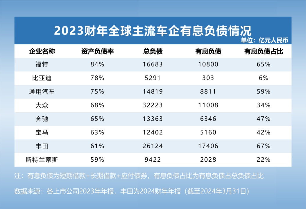 从数据显而可见,海外主流车企的有息负债非常很高,2023年丰田有息负债1.7万亿,在总负债占比达67%;大众集团有息负债1.1万亿,在总负债占比34%;福特有息负债约1.08万亿,在总负债占比65%;通用汽车、奔驰、宝马、斯特兰蒂斯的有息负债也达到数千亿的规模。