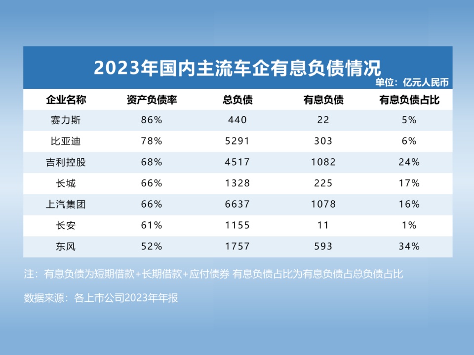相比之下,国内主流车企的有息负债显然低得多。吉利控股有息负债1082亿,在总负债占比24%;比亚迪有息负债303亿,在总负债占比仅为6%。