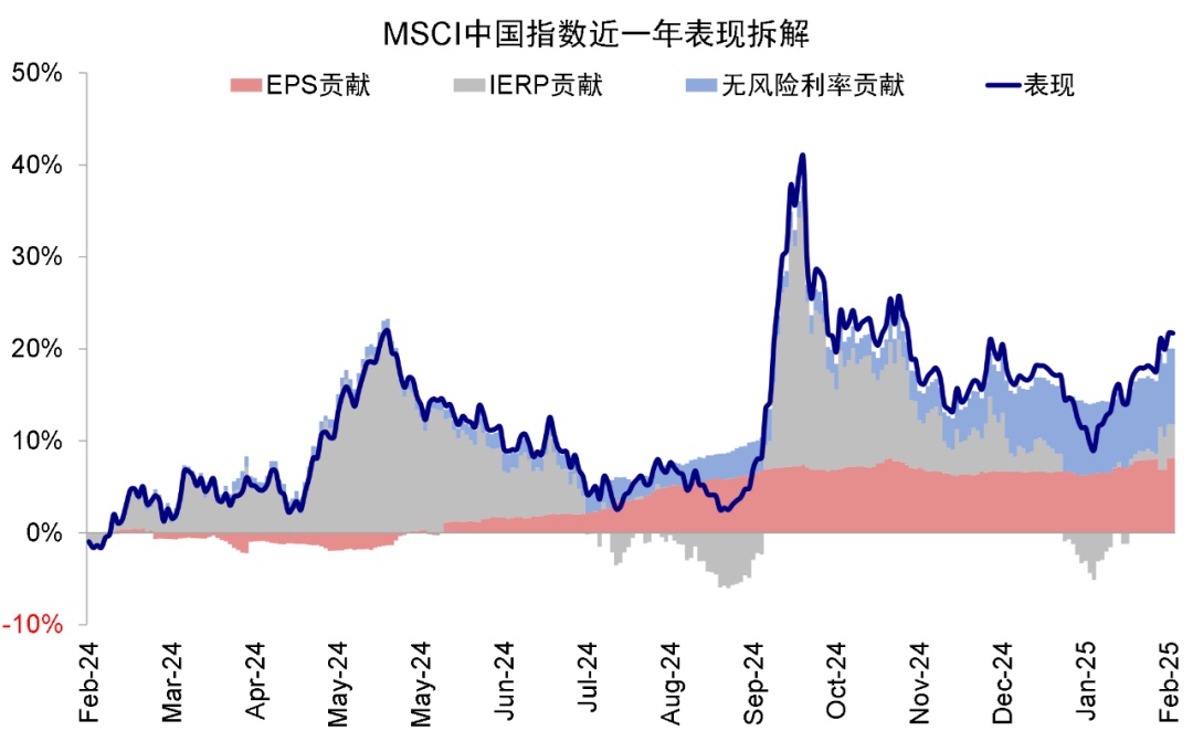 2) 其次,情绪推动风险溢价回落是主要驱动力。1月中旬以来MSCI中国指数超过10%的涨幅中,盈利贡献仅为1.7%,估值扩张则贡献了8.8%占绝大部分。进一步拆解后可以发现,风险溢价回落贡献了8.3%,无风险利率仅小幅贡献0.5%,说明情绪是主要驱动力。