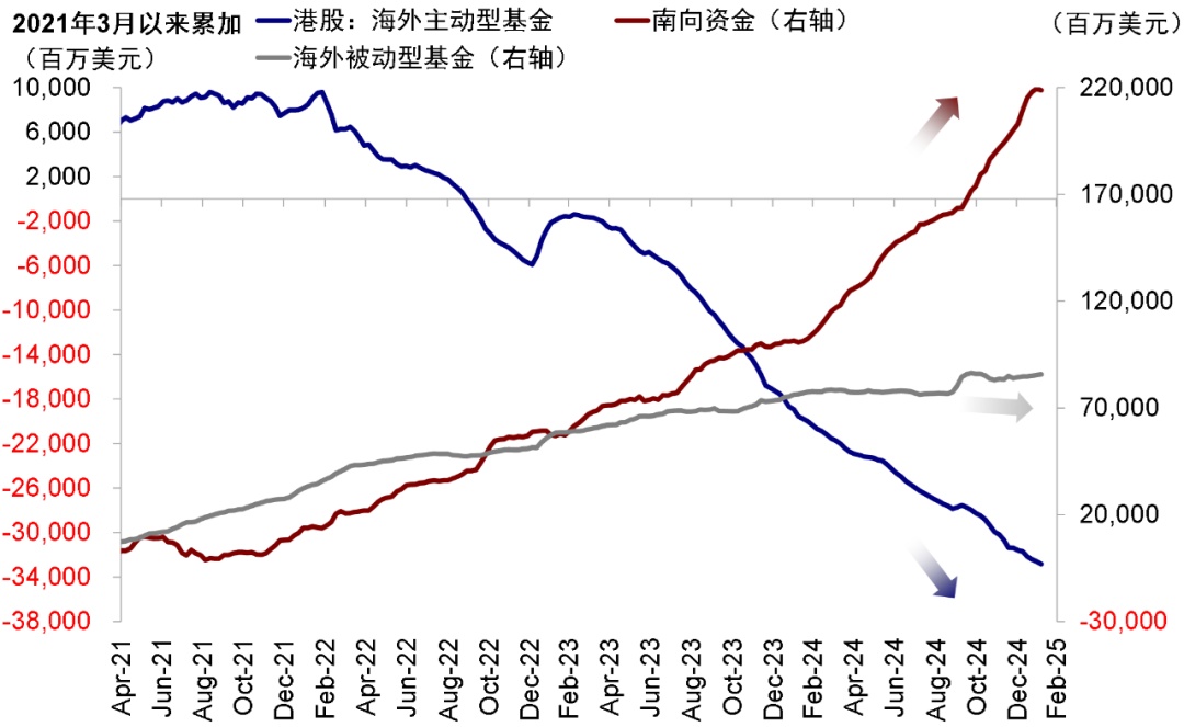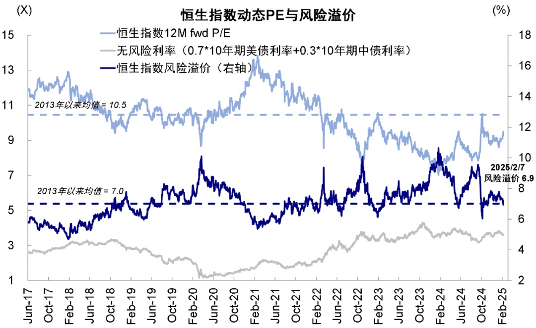 1) 首先,催化剂上:本轮港股市场反弹的开启可以回溯至一月中旬,我们在当时提示恒指19,000点是日线、周线与月线的关键支撑位,市场也在开年头两周一度跌破这一点位后旋即反弹。在具体事件催化剂上,节前六部委联合发文推动中长期资金入市、特朗普上任后关税比预想的更为“温和”、美债利率回落、尤其是国内人工智能企业发布DeepSeek-R1模型提振了节后市场整体的情绪。