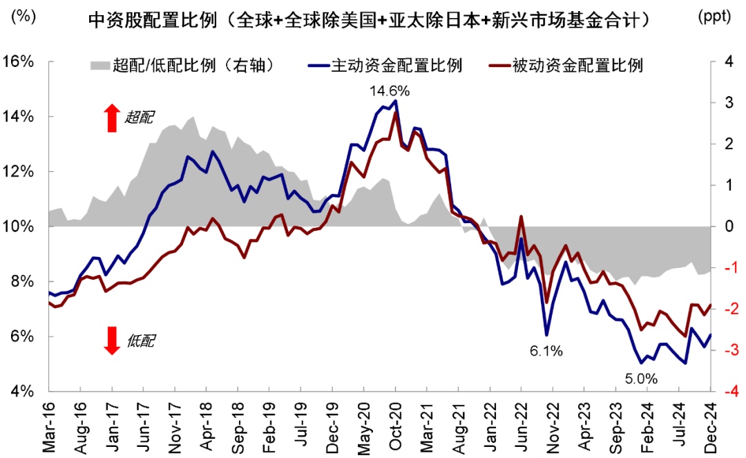 与此同时,EPFR最新公布的数据显示,截至2024年12月底,海外主动资金对中资股的配置比例从9月低配0.9ppt降至目前低配1.1ppt,仍处于历史低位。