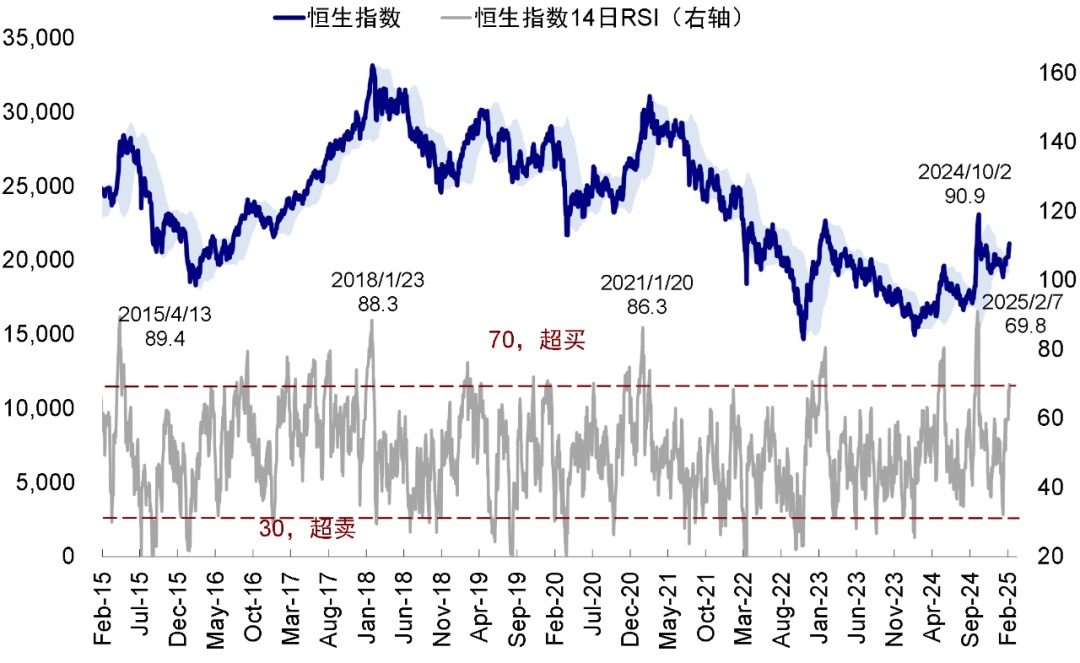 与此同时,一些技术指标已出现透支迹象,例如衡量超买程度的相对强弱指标(14日RSI)已从1月中旬的32.1%快速升至当前的69.8%,逼近超买区间(70%以上,图表5)。港股卖空成交规模与占比也不降反升(图表4),表明投资者内部对于本轮上涨行情依然存在分歧。