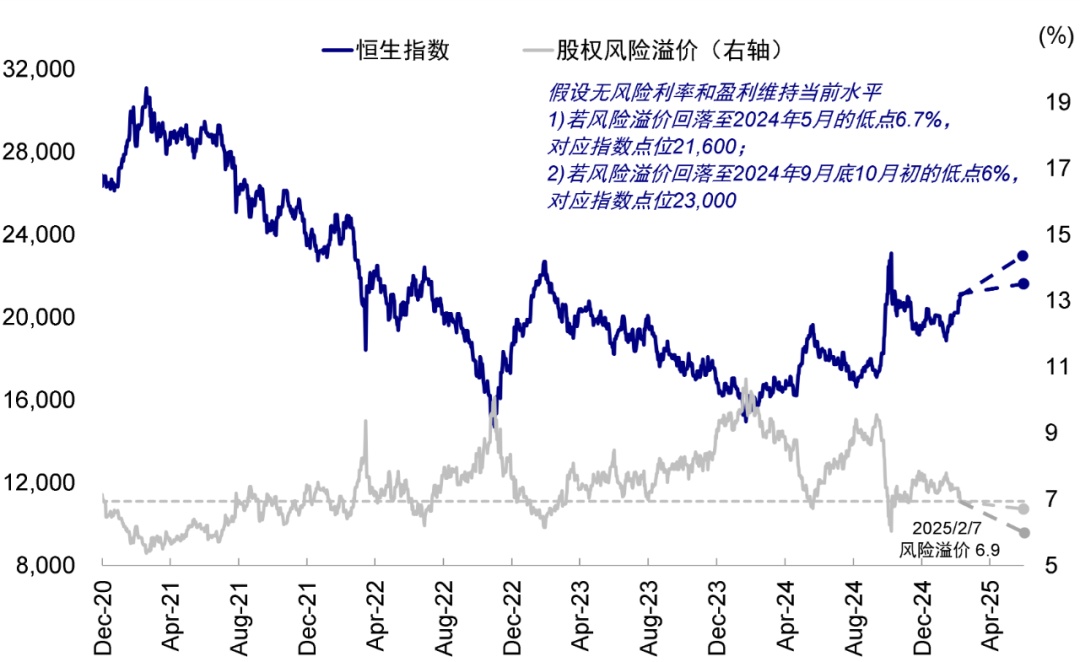 图表:假设无风险利率与盈利维持当前水平,若风险溢价回落至去年5月低点,对应恒指约21,600点。若回落至去年10月初,则有望达到23,000点,但较为勉强