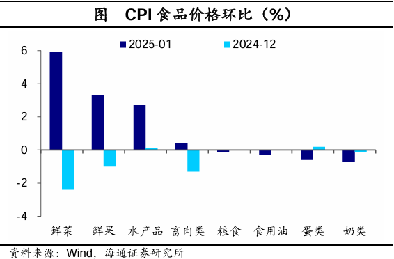 猪价方面,当前生猪供给仍较充裕,1月猪肉价格仅小幅上涨1.0%。往后看,我们认为2025年猪价大概率依然承压,偏宽松的供给还将持续。理论上,能繁母猪的存栏量决定了10个月后的生猪出栏量,进而也将决定届时猪肉价格的主要走势。具体来看,2025年对应的10个月前能繁母猪同比呈现大体向上的趋势,这意味着全年猪价大概率将呈现偏弱震荡的格局。整体来看,1月食品价格涨幅显著低于季节性(2014、2017、2020、2023年食品CPI环比均值3.0%),除了猪肉涨价偏弱外,今年冬季大部分地区气温较往年偏高,果蔬类产量相对充足也有影响。