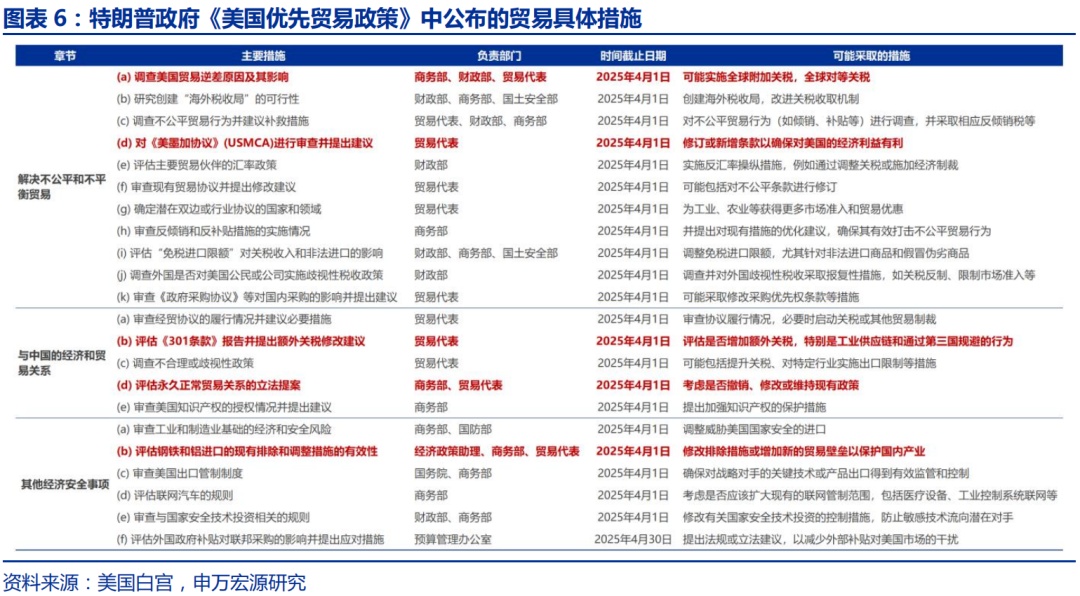 第二类是长期型关税,是未来贸易战的重点,核心是解决贸易不平衡问题。长期型关税属于真正意义上的贸易政策,卢特尼克1月29日的听证会上称“长期型关税需要研究和审查,将可能在4月1日后开始实施”。特朗普1月20日签署的《美国优先贸易政策》命令内容主要侧重于长期型关税的实施。截至2月上旬,2025年真正意义的贸易战可能尚未到来。