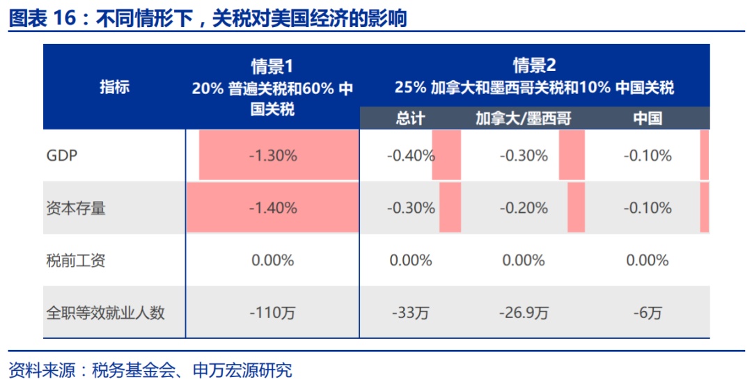 不同情形下,关税或使美国GDP下跌0.4至1.3个百分点。若美国仅实施对中国的10%及对加拿大、墨西哥的25%关税,或导致美国 GDP 下降0.4个点,其中对加拿大和墨西哥加征关税的影响更大,对中国加征的影响稍低。若美国未来实施全球关税并扩大对华关税力度,则可能会使美国GDP下降1.3个百分点。
