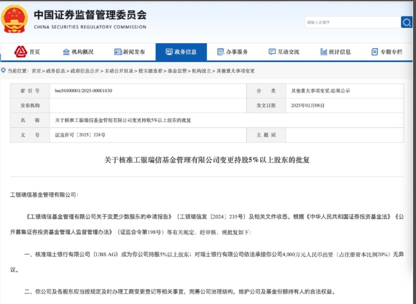 证监会网站显示,2月8日,证监会网站发布《关于核准工银瑞信基金管理有限公司变更持股5%以上股东的批复》,核准瑞士银行有限公司(UBS AG)成为工银瑞信基金持股5%以上股东;对瑞士银行有限公司依法承接工银瑞信基金4000万元人民币出资(占注册资本比例20%)无异议。