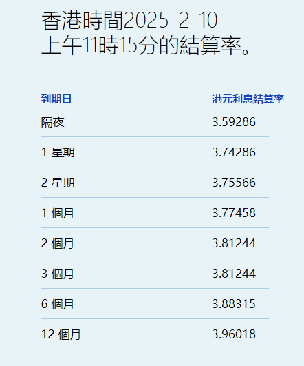 智通财经APP获悉,2月10日,港元拆息几乎全线向下,其中,隔夜息大跌近半厘至3.59286%,见1月24日以来最低,而与楼按相关的一个月拆息亦结束两连升,报3.77458%,为2月5日后最低。