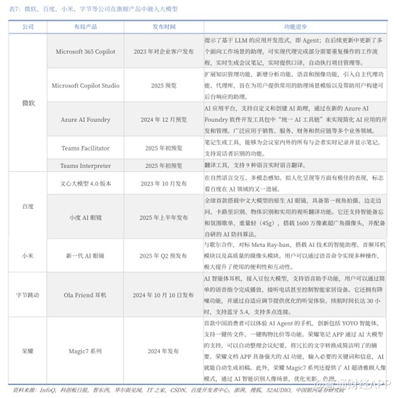 ToC领域,微软、百度、小米等多家科技公司已在旗舰产品中融入大模型,促使应用生态调整接口。头部科技公司均在悄然发力C端市场,推出了自研AI Agent,并在新旗舰产品中融入大模型,促使应用生态调整接口,逐步形成模型生态。