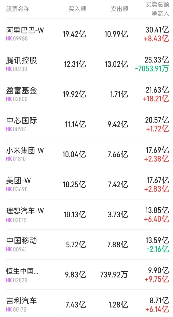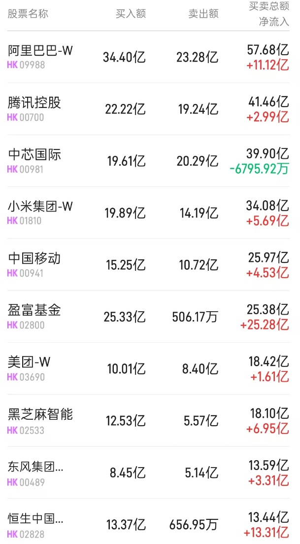 北水净买入最多的个股是盈富基金(02800)、恒生中国企业(02828)、阿里巴巴-W(09988)。