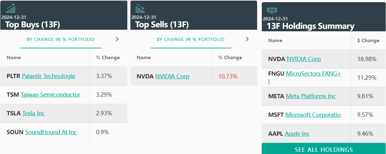 具体来看,2024年四季度,东方港湾海外基金新买入3只股票,分别是Palantir、台积电、SoundHound AI;加仓特斯拉;减持英伟达和FNGU。此外,该基金对Meta、微软、苹果、谷歌C、TQQQ(3倍做多纳斯达克100ETF)、亚马逊、NVDL(2倍做多英伟达ETF)、TNA(3倍做多小盘股ETF)的持仓保持不变。