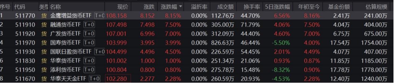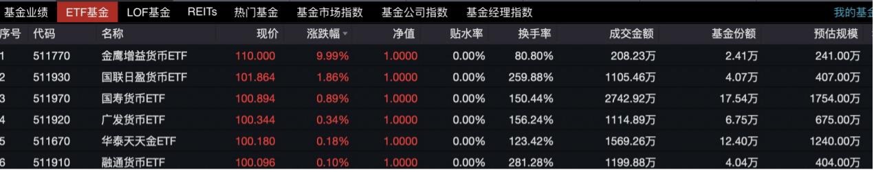 截至收盘,金鹰增益货币ETF涨停至9.99%,国联日盈货币ETF、国寿货币ETF、广发货币ETF、华泰天天金ETF以及融通货币ETF虽然有所回落,但是涨幅依然偏离净值参考。
