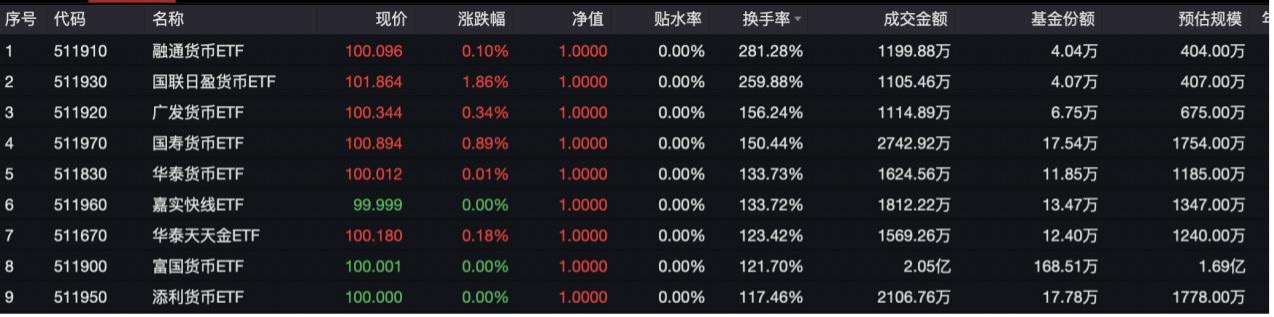 换手率指标上,依然是“场内盘子越小,表现越妖”。全市场9只货币ETF换手率翻倍,其中,融通货币ETF、国联日盈货币ETF换手率分别达到281.28%、259.88%。