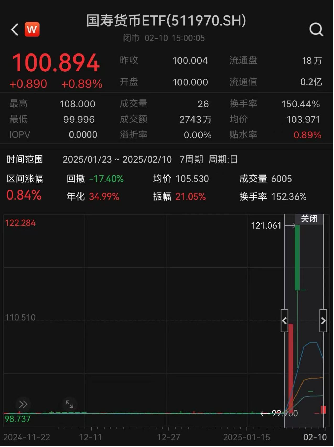1月24日,多只货币基金异动拉升,这是货币ETF史上第一次出现集中涨停,鹏华添利ETF、国寿货币ETF、广发添利货币ETF、华泰天天金盘中均一度触及涨停。彼时有基金经理分析称,节前场内资金集中买入货基ETF,部分资金是持币过节的需求,炒作资金闻风而上。