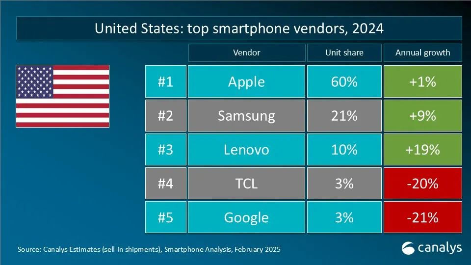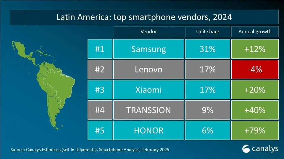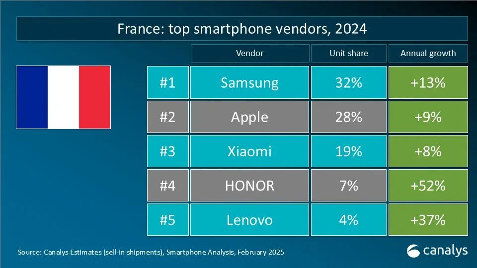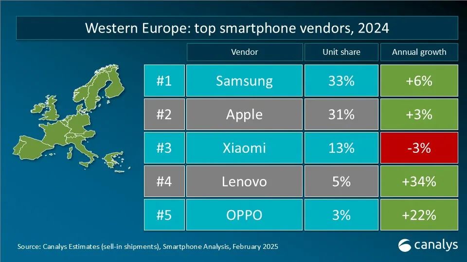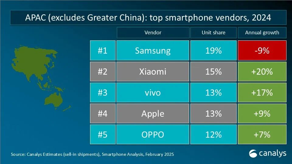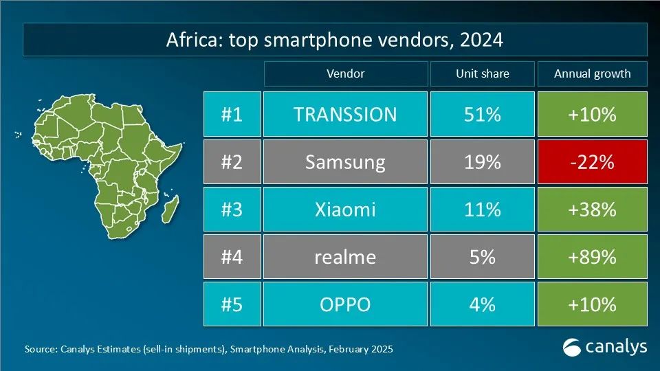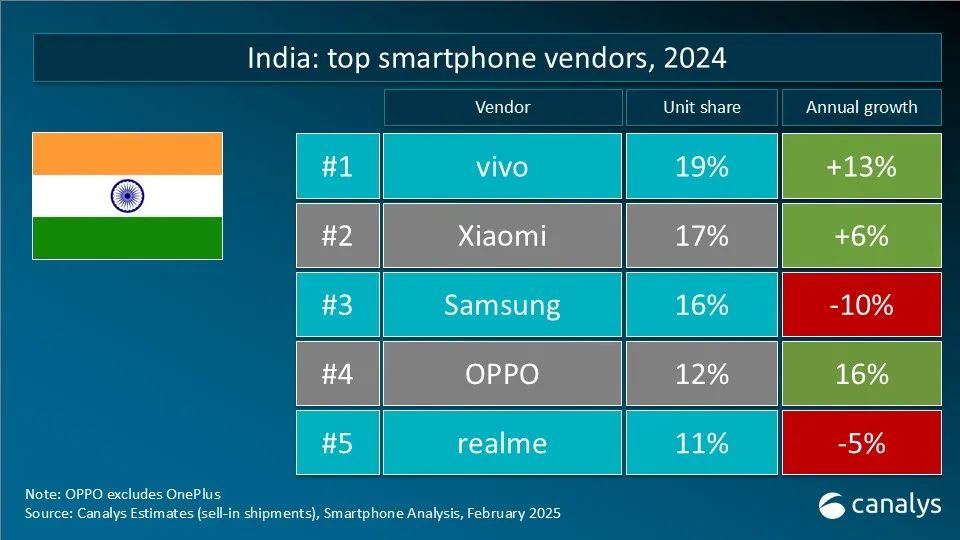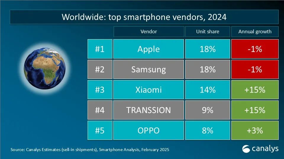 三星紧随其后,继续聚焦盈利能力,其出货量同样下降1%至2.229亿部。小米(01810)稳居第三,并成为2024年行业出货量增长的最大贡献者。受中国大陆市场的强劲势头以及在新兴市场的持续战略扩张推动,小米出货量增长15%,达到1.686亿部。传音(688036.SH)首次跻身第四,而OPPO(包括一加)位列第五,分别增长15%和3%至1.067亿部和1.036亿部。