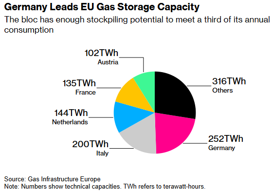 欧盟各地的天然气储存设施网络是仅次于美国的世界第二大天然气储存设施,并且已成为缓解供应冲击和价格飙升的重要缓冲。