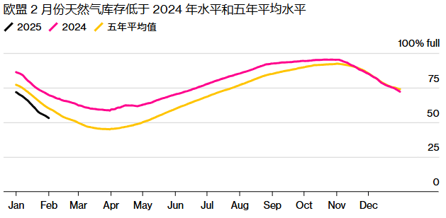 2024-25 年冬季供暖季,欧盟的天然气储备迅速耗尽。天气比一年前更冷,无风天也更多,这增加了对天然气的需求,迫使各国动用其储备。再加上俄罗斯通过乌克兰的管道天然气损失,2 月初欧盟的天然气仓库仅装满约 50% ,远低于一年前的近 70%,也是自 2022 年能源危机以来今年这个时候的最低水平。