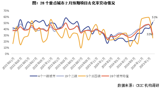 而从市场热度来看,或将延续高位波动:据CRIC监测数据,28个重点城市2025年2月预期项目平均去化率32%,同比上升8个百分点。值得关注的是,一线新政效应延续,整体市场热度有望稳中有增,2025年2月预期去化率达到51%,迎来了近1年高点。