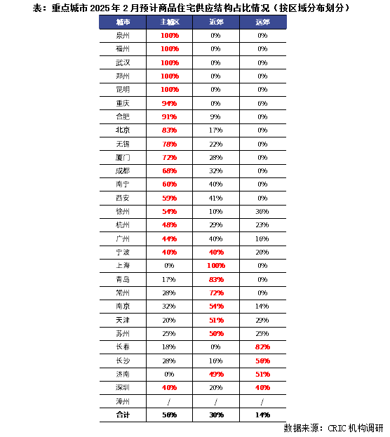 从供应结构各项目区域分布来看,重点城市主城、近郊、远郊占比结构为56%、30%和14%,本月供应重心仍集中在主城区,近郊次之,远郊最少。