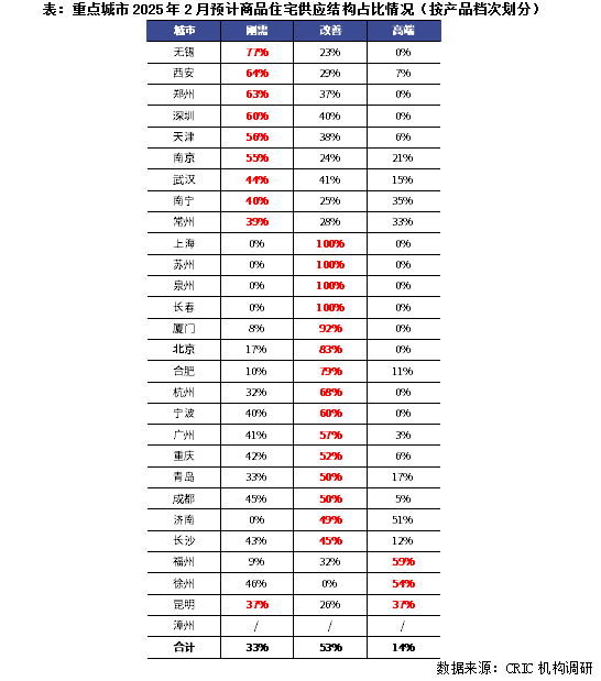 从供给结构来看,重点城市刚需、改善、高端占比结构为33%、53%和14%,呈现出以改善为主,刚需为辅的供应结构。近6成城市以主城为供应主力。预判后市,克而瑞认为,2月成交同比仍将延续正增态势,市场热度延续高位波动,28个重点城市2025年2月预期项目平均去化率32%,同比上升8个百分点。一线新政效应延续,预期去化率高达到51%,迎来了近1年高点。