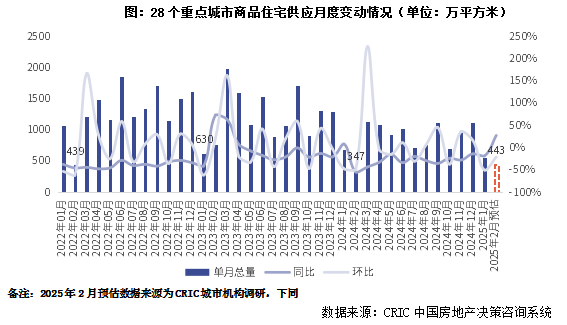 据CRIC调研,2月28个重点城市预计新增商品住宅供应面积443万平方米,环比下降21%,同比上升28%,主要源于去年2月为春节假期,基数较低所致。从绝对量来看,房企整体推盘热情“比上不足比下有余”,略好于2024年和2022年春节同期,不过与2023年春节月相比仍有差距。