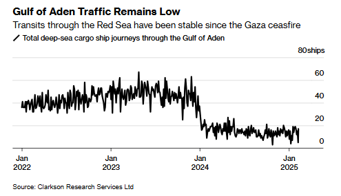 智通财经APP获悉,近期,尽管也门胡塞武装已持续数周未发动袭击,但红海地区的船舶通行量依然低迷。