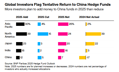 调查显示,净7%的受访者计划在2025年增加对中国多策略基金的配置。尽管这一比例看似不高,但与2024年相比已有所改善,当时17%的受访者继续削减此类投资。2023年,情况甚至更糟,高达42%的受访者选择从中国对冲基金中撤资。