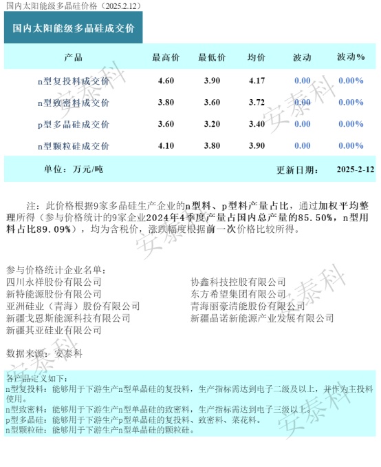 智通财经APP获悉,硅业分会发文称,本周为节后首周,多晶硅市场价格整体较为稳定。n型复投料成交价格区间为3.90-4.60万元/吨,成交均价为4.17万元/吨,n型颗粒硅成交价格区间为3.80-4.10万元/吨,成交均价为3.90万元/吨,p型多晶硅成交价区间为3.20-3.60万元/吨,成交均价为3.40万元/吨。截至目前,我国所有在产多晶硅企业基本均处于降负荷运作状态。现阶段头部企业与其他企业的市场感知情况出现较大差异,预计接下来的市场价格将持续一段时间的僵持博弈,企业成交价格分歧有加大倾向。