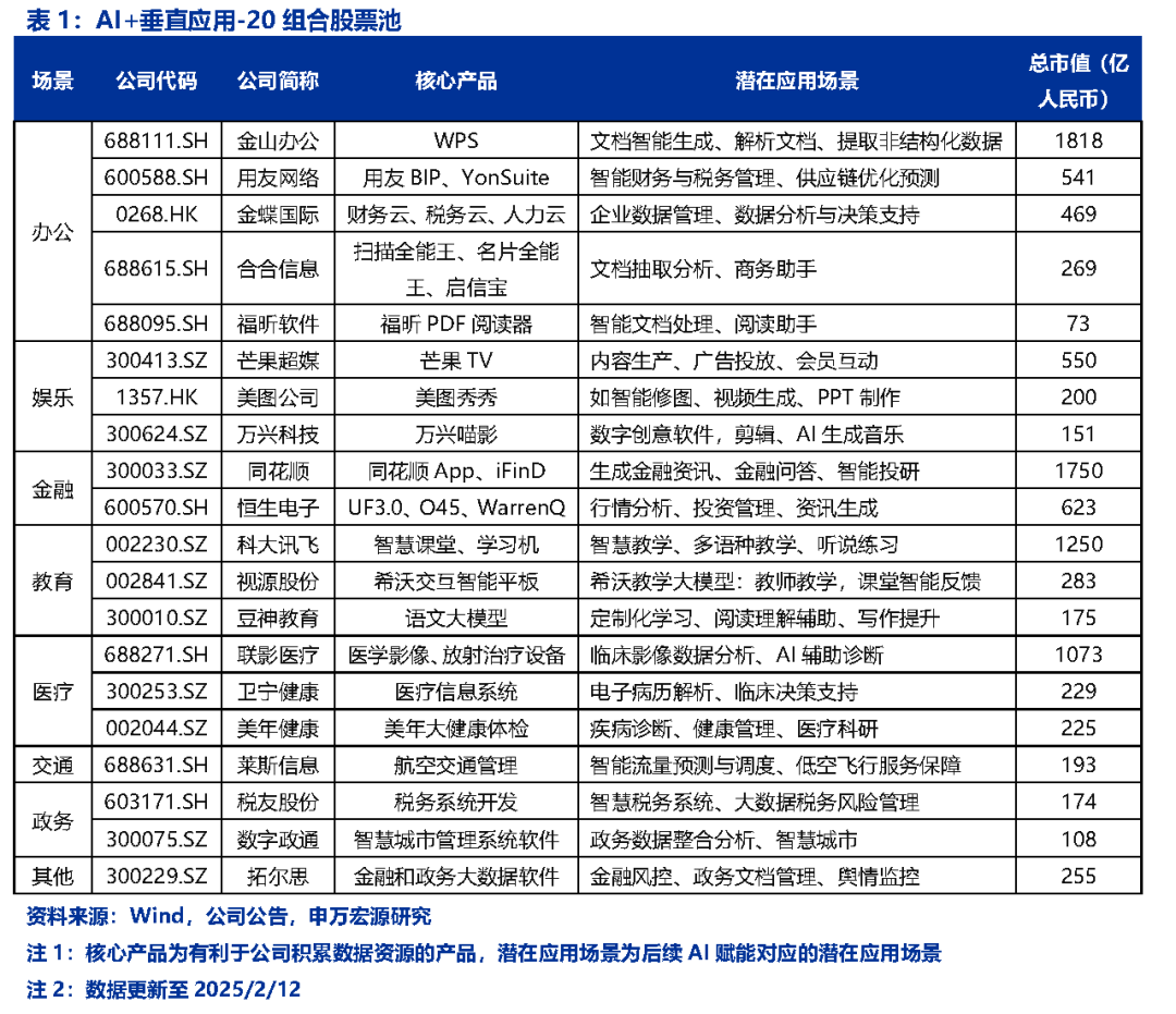 一个可商业化的AI垂类应用需要结合数据、模型、政策、市场的协同推动,因此,我们结合各公司数据资源潜力(包括行业数据、用户数据),以及公司在AI智能化方面的战略,综合筛选出“AI+垂直应用”的20个可关注标的,列示于表1中,以供参考。