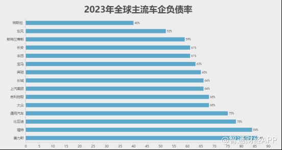 高负债是传统车企的共性特征,目前全球主流车企的资产负债率普遍在60%以上,最高的甚至超过80%。